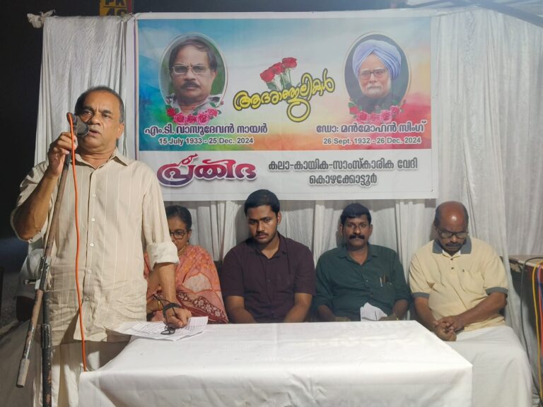 അരീക്കോട് : കൊഴക്കോട്ടൂർ പ്രതിഭ കലാ കായിക സാംസ്കാരിക വേദി എം ടി വാസുദേവൻ നായർ, മൻമോഹൻ സിംഗ് എന്നിവരുടെ വിയോഗത്തിൽ അനുസ്മരണ യോഗം സംഘടിപ്പിച്ചു. ജയൻ തവനൂർ സ്വാഗതം പറഞ്ഞ യോഗം രേമേഷ് ബാബു അധ്യക്ഷനായി. എം. നാസർ, എം ടി മുസ്തഫ, ശ്രീജ അനിയൻ, വാസു അരീക്കോട്, സുരേഷ് മാസ്റ്റർ തയ്യിൽ, നജാഹ്, സാദിക്ക്. പി, നാമീർ പനോളി തുടങ്ങിയവർ സംസാരിച്ചു. നഹീം പുതുവന നന്ദി രേഖപ്പെടുത്തി.